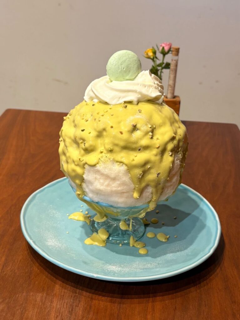 メニューには、通年で楽しめる定番のかき氷が3種類。さらに、季節ごとに新作が登場します。看板メニューはRestaurantSpoon監修「金のピスタチオ」イタリア産の上質なピスタチオペーストを贅沢に使用した、自家製ピスタチオクリームをご堪能ください。